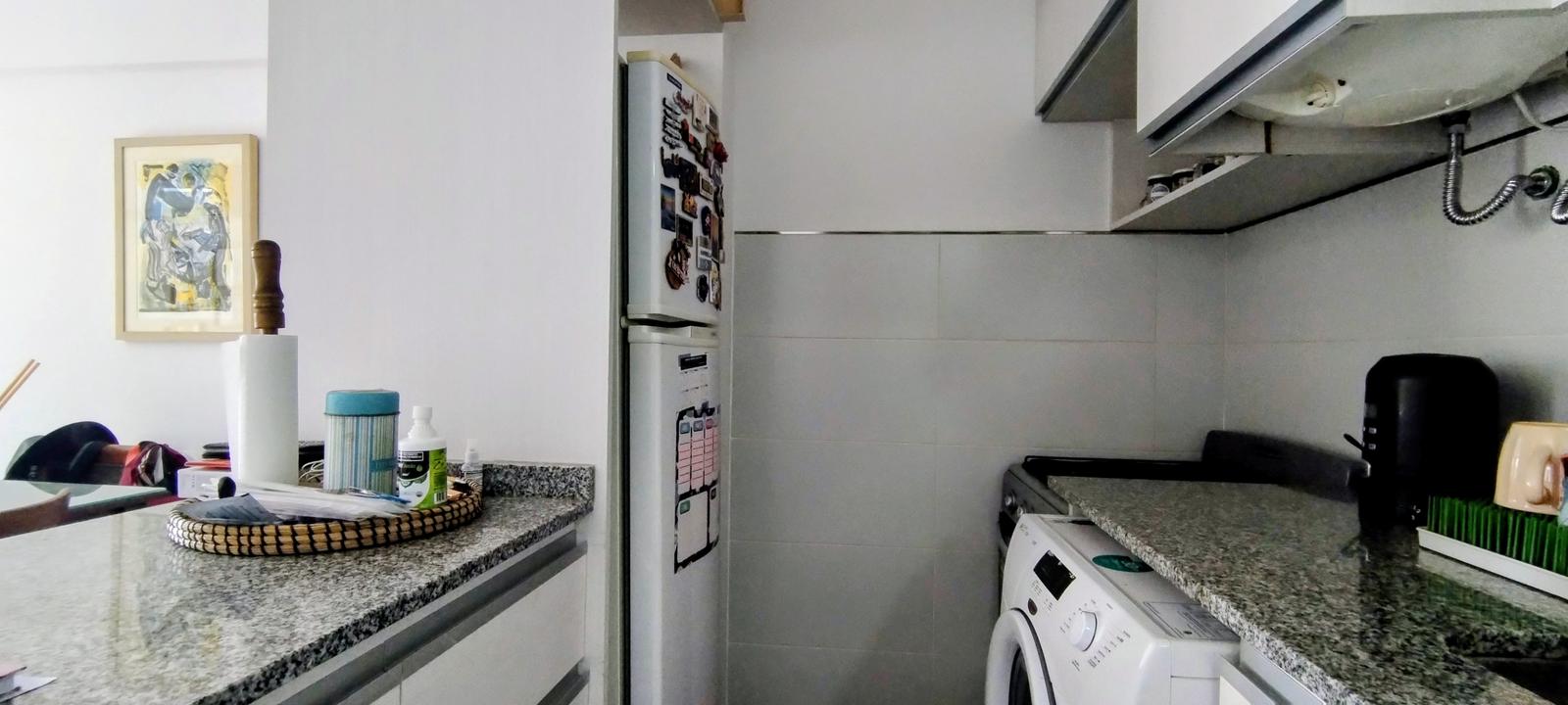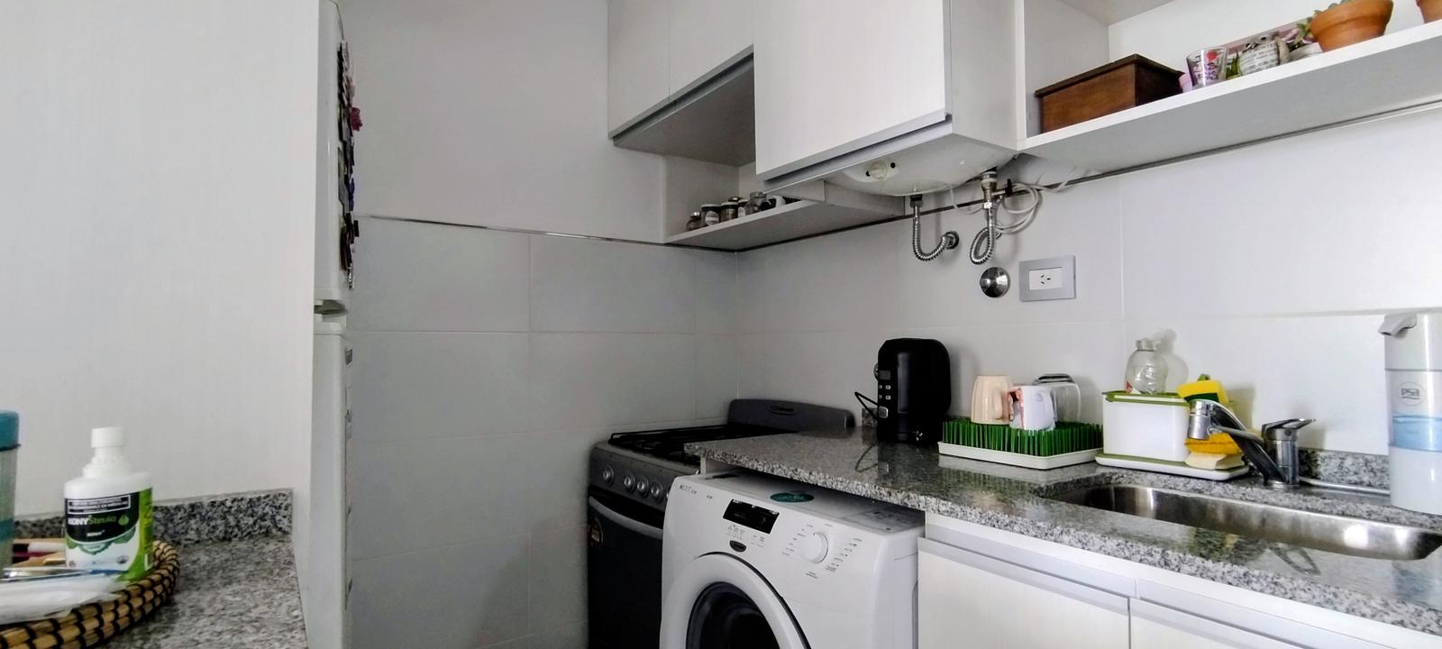 Cocina integrada, moderna y funcional, separada del living por una barra desayunadora.